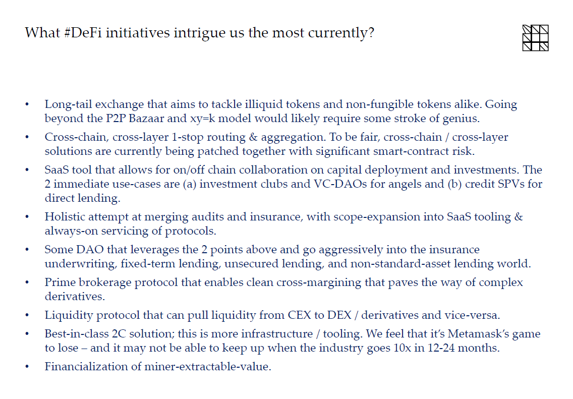 (11) Here’s a short list of things that intrigue us in #DeFi today…if you are buidling them feel free to get in touch. In particular, we eagerly await elegant solutions that specifically tackle long-tail assets beyond P2P Bazaar & xy=k models.