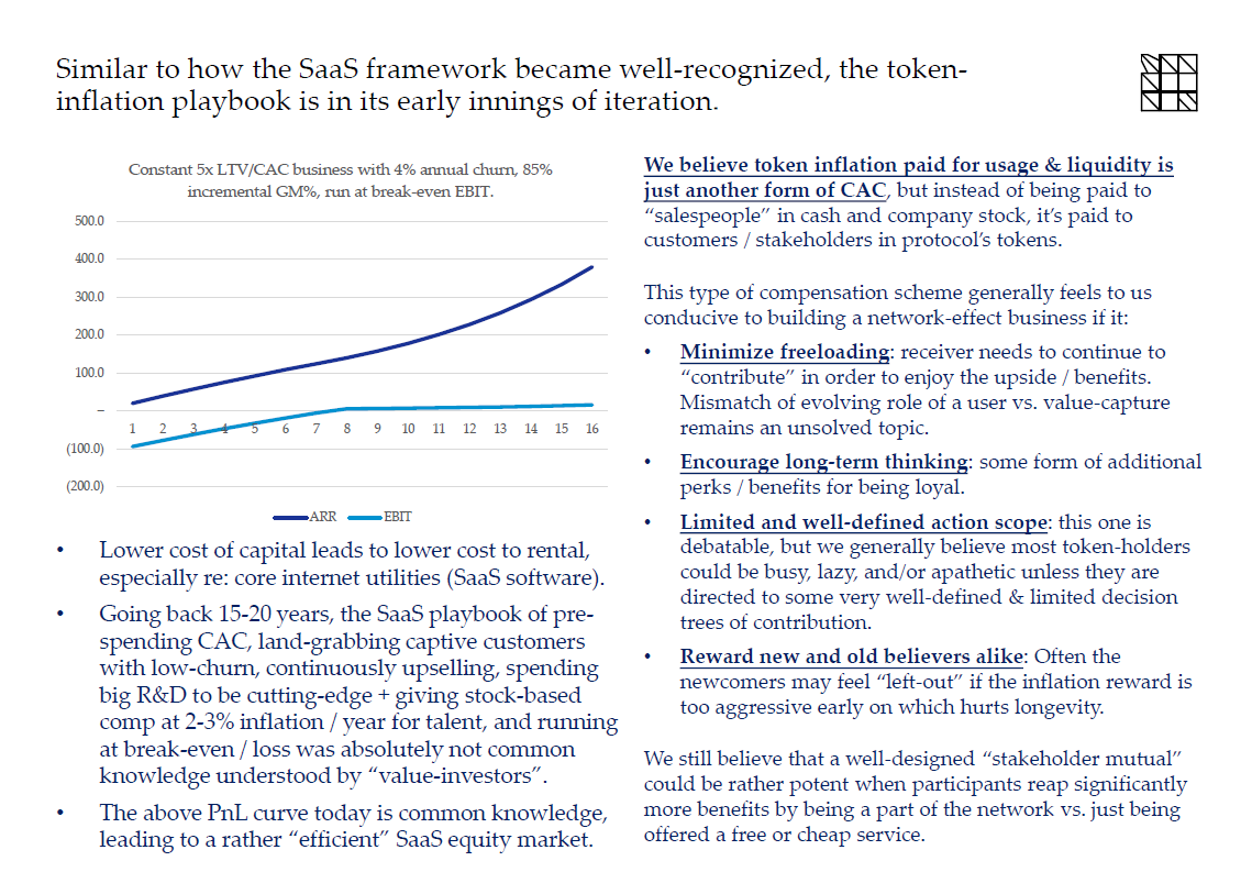 (12) Token-incentive-mechanism remains unsolved, with real challenges around balancing the evolving user-involvement vs. ownership & rent-extraction permanency. Nonetheless, it feels similar to us as an alternative SaaS playbook of growth-hacking+
