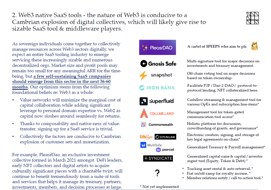 (16) A new SaaS tooling stack is forming along with the proliferation of protocol treasuries and individual collaboratives. The TAM & ARR opportunity is still a bit small today, but the PMF is pretty immediate and we eagerly look for key winners here.