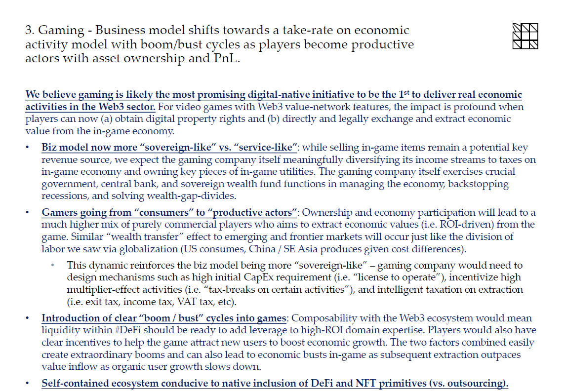 (17) Via bestowing property rights & human rights (i.e. ability to extract ROI from game vs. pure subscription), gaming companies go from SaaS biz to gov-like toll-road models on in-game economy. Gaming is likely the 1st initiative to deliver real, sizable economic value to Web3.