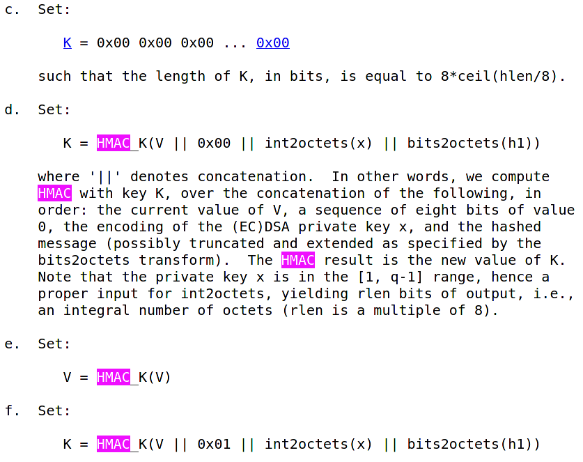 8a/ There's a nuance in RFC6979 for those attempting to generate *deterministic* ecdsa (secp256k1) keys that goes further than simply deriving the value 'k' from HMAC'ing (h+x)