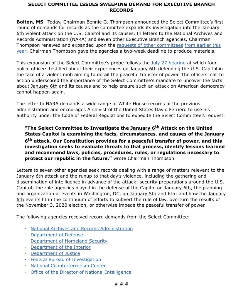 INBOX: Jan. 6 committee issues first broad records request, including to National Archives for records of Trump White House.