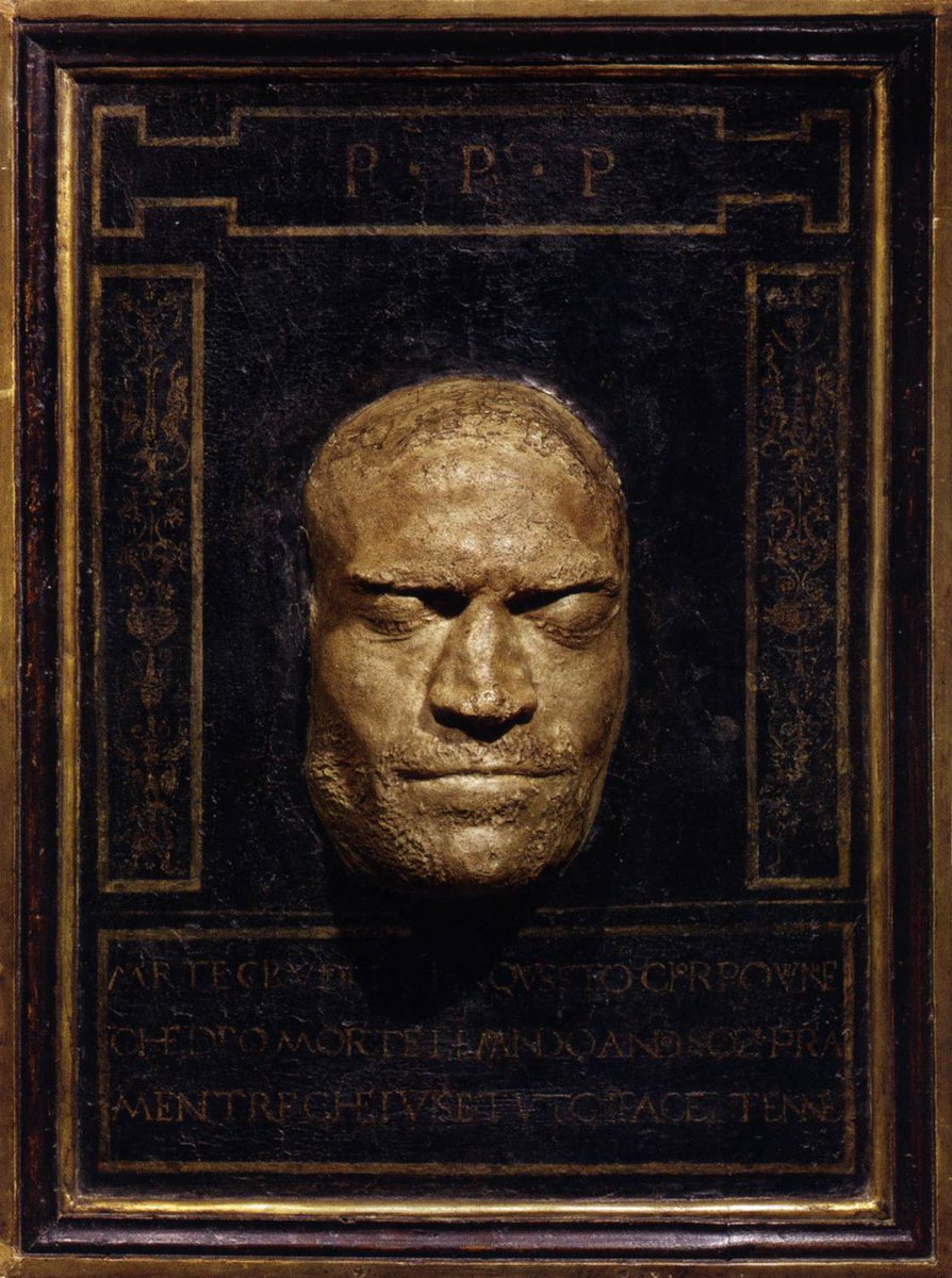 En estos casos se busca plasmar el rostro muerto con la veracidad que sólo una máscara mortuoria podía ofrecer. A la izquierda, el rostro de un varón en el @V_and_A y, a la derecha, un retrato atribuido a Battista Sforza conservado en el @MuseeLouvre