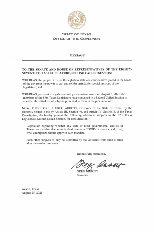 More news — Abbott is asking #txlege to pass a law during the ongoing special session that would codify his ban on vaccine mandates: gov.texas.gov/uploads/files/…