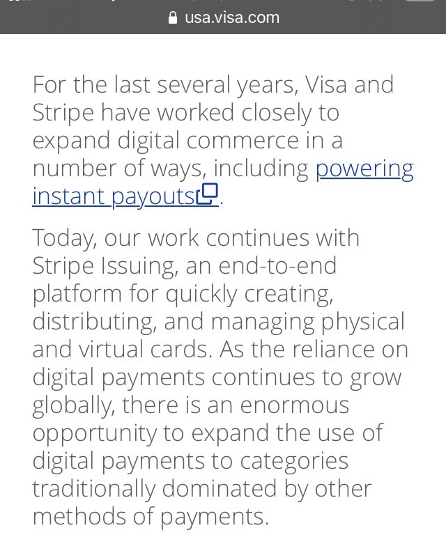 In case you have any doubts about whether or not these branded cards (that can be instantly created with a few lines of code by Stripe merchants) can be used to preload with cash, here is the Visa press release about Stripes “Instant Payouts” feature.