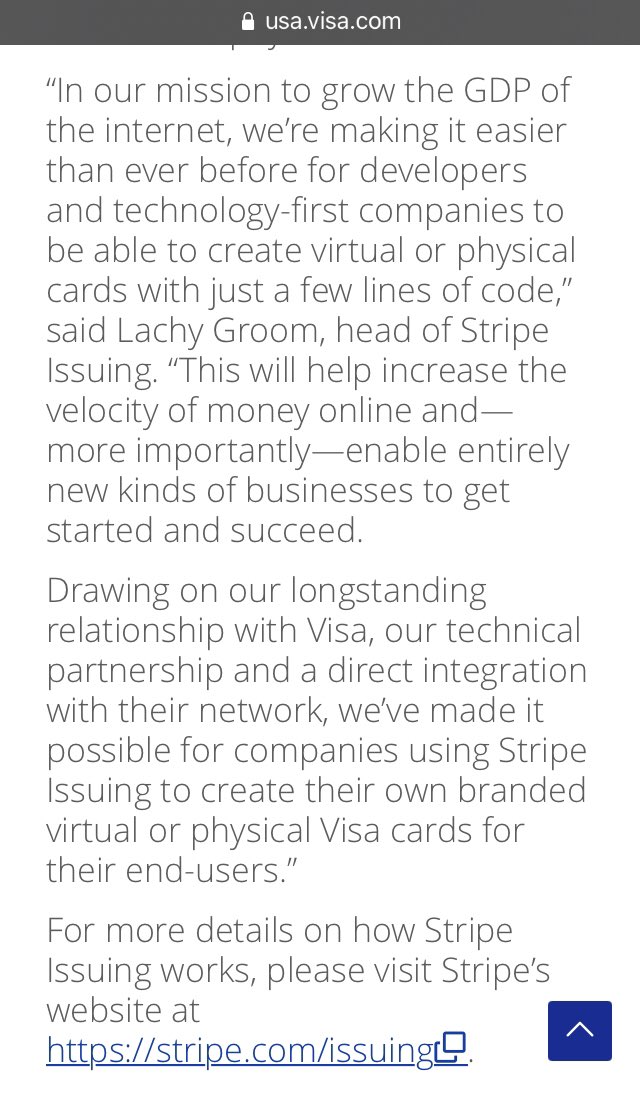 “…Drawing on our longstanding relationship with Visa, our technical partnership and a direct integration with their network, we’ve made it possible for companies using Stripe Issuing to create their own branded virtual or physical Visa cards for their end-users.”