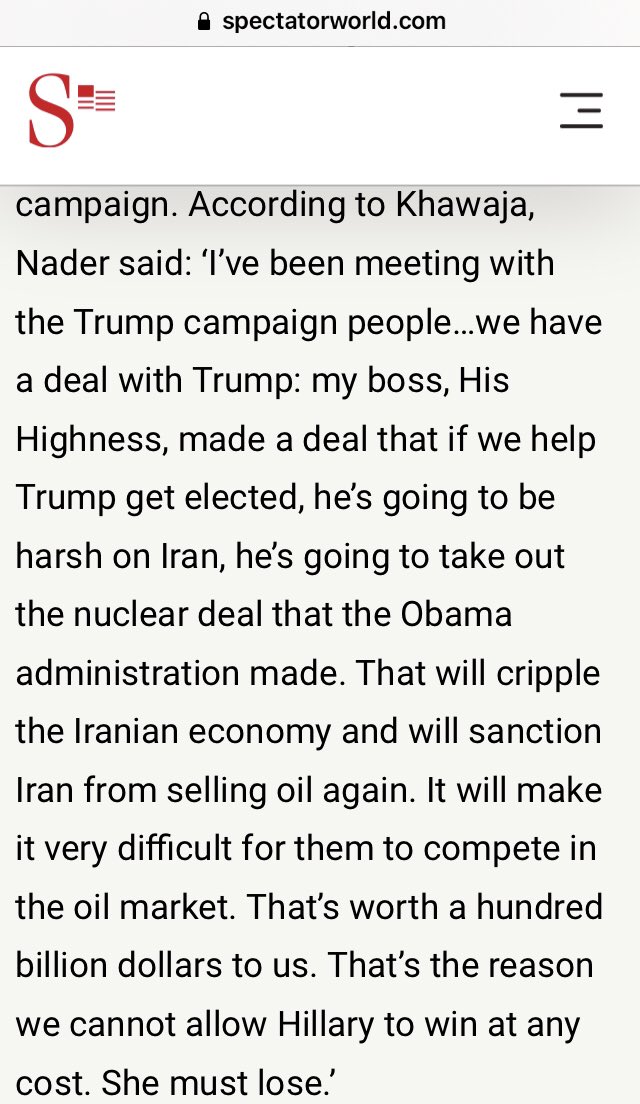 Khawaja claims that Nader told him that the Emiratis wanted to keep Iranian oil out of the open market and had cut a deal with the Trump campaign to back out of the Iranian nuclear deal and keep Iranian oil under sanctions.