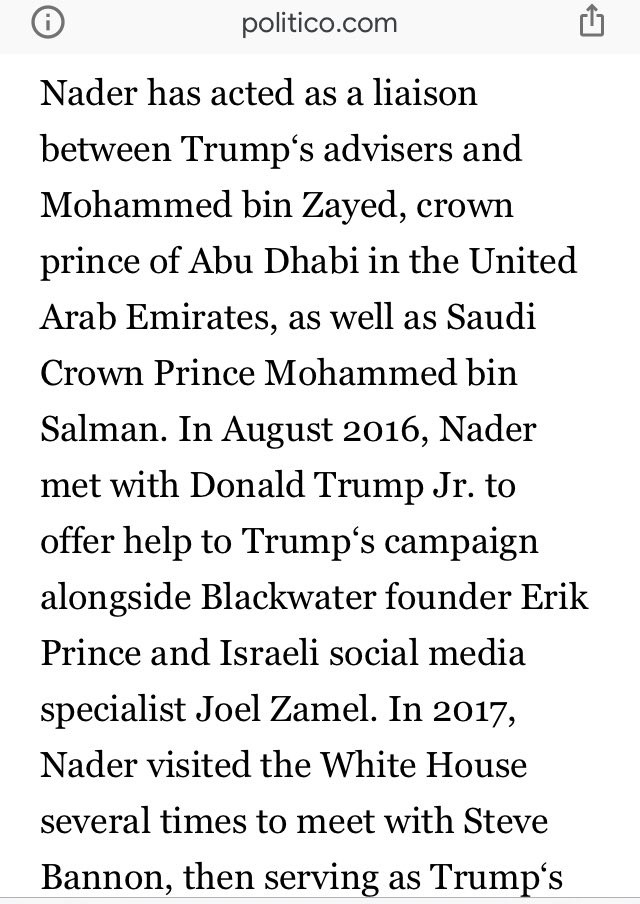See also: “Nader has acted as a liaison between Trump‘s advisers and Mohammed bin Zayed, crown prince of Abu Dhabi in the United Arab Emirates, as well as Saudi Crown Prince Mohammed bin Salman.”