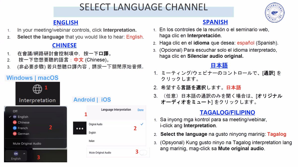 Instructions for language interpretation are being given in Chinese, Spanish, Japanese, and Tagalog.