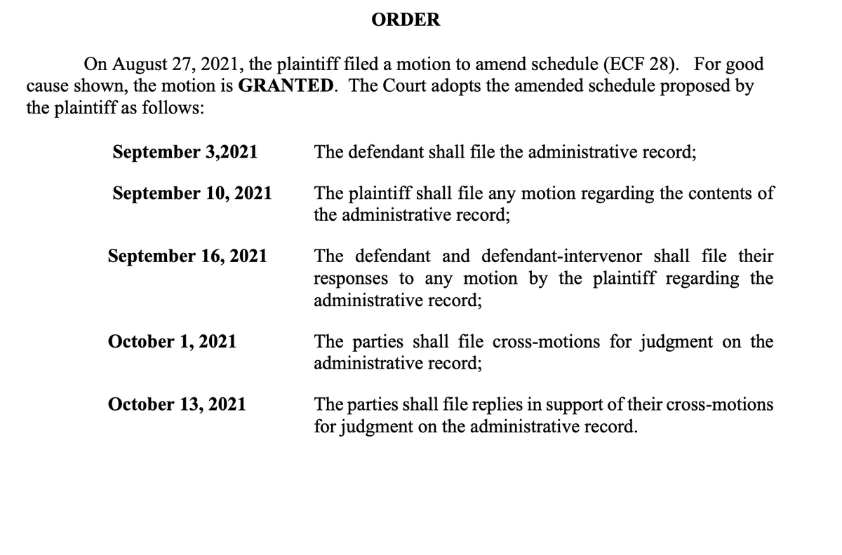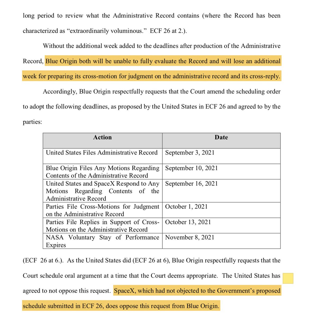 SpaceX — "which had not objected to the [DOJ/NASA's] proposed schedule..." — opposed Blue's motion, but judge later grants it, presumably expanding SpaceX's HLS contract stay to Nov. 8 (though the judge's schedule doesn't include that).
