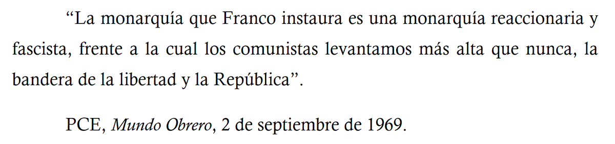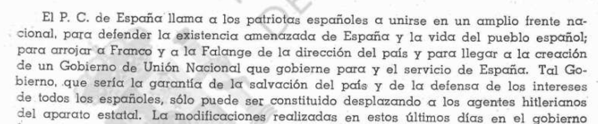 Más de una década antes, el PCE llamó a articular "un amplio frente nacional (...) para llegar a un Gobierno de Unión Nacional (...) garantía de la salvación del país y de la defensa de los intereses de todos los españoles". Se comenta solo.