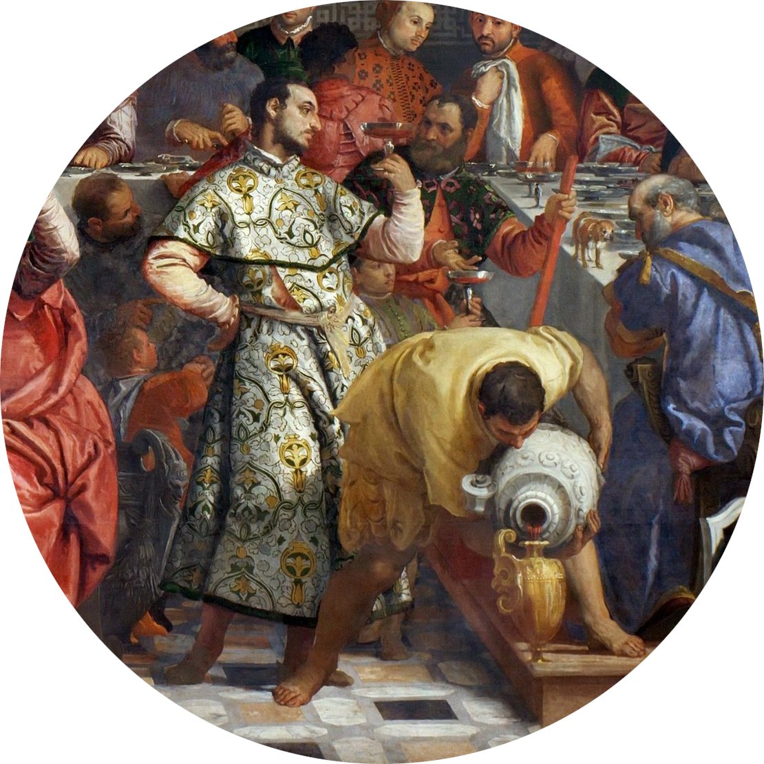 10. Müzisyenlerin hemen sağında, işlemeli elbisesiyle ayakta duran ve kadehindeki şarabı inceleyen figür, ressamın kardeşi Benedetto.