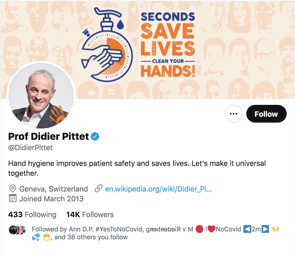 2/ Mais, qui est Professor Pittet? Well, he is a staunch proponent of the importance of hand hygiene, an important intervention in infection control, as Dr Ignaz Semmelweiss would certainly attest. Professor Pittet's Twitter profile shows us how strongly he feels about it. 👇