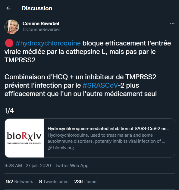 Dans les cellules qui possèdent TMPRSS2, L'HYDROXYCHLOROQUINE NE MARCHE MÊME PAS IN VITRO ! Pas d'effet antiviral notable ! nature.com/articles/s4158…