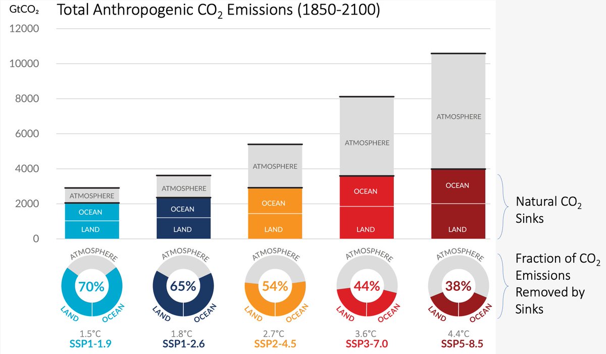 However, the total fraction of emissions removed by the land and ocean sinks is smaller in higher emission scenarios. That is, we get relatively more help from nature in low emission scenarios than in high emission scenarios.