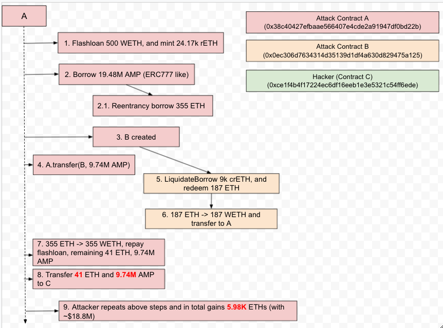 2/4 The hack is made possible due to a reentrancy bug introduced by $AMP, which is an ERC777-like token and exploited to re-borrow assets during its transfer before updating the first borrow.