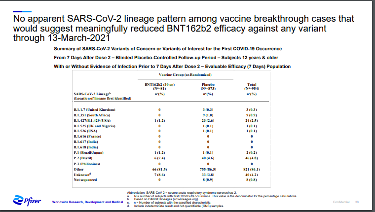 💉Účinnost vakcíny Pfizer prezentované ACIP...pokračování 💉No apparent SARS-CoV-2 lineage pattern among vaccine breakthrough cases that would suggest meaningfully reduced BNT162b2 efficacy against any variant through 13-March-2021
