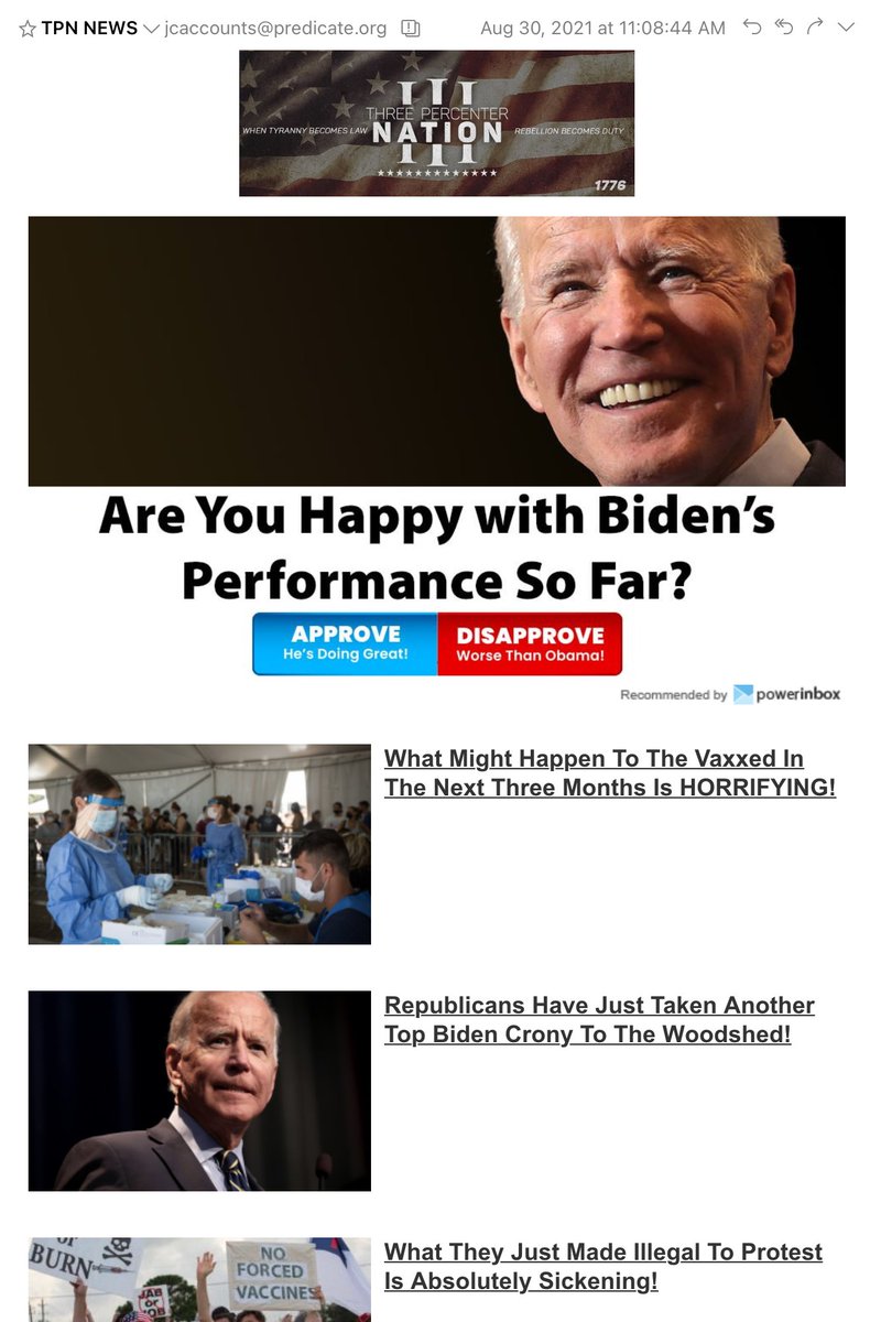 Take this morning's email from "TPN News" — aka "Three Percent Nation," a reference to a far-right group that advocates active resistance to the corrupt, liberal federal government. (en.wikipedia.org/wiki/Three_Per…). Mind you, TPN News