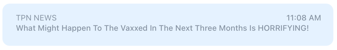 This morning's email had an alarming headline: "WHAT MIGHT HAPPEN TO THE VAXXED IN THE NEXT THREE MONTHS IS HORRIFYING!" Again, it's typical of the genre: vague but terrifying, or vague but infuriating, or vague but schadenfreudey.