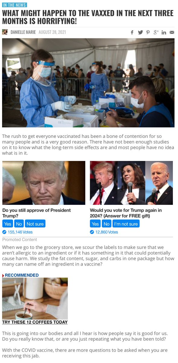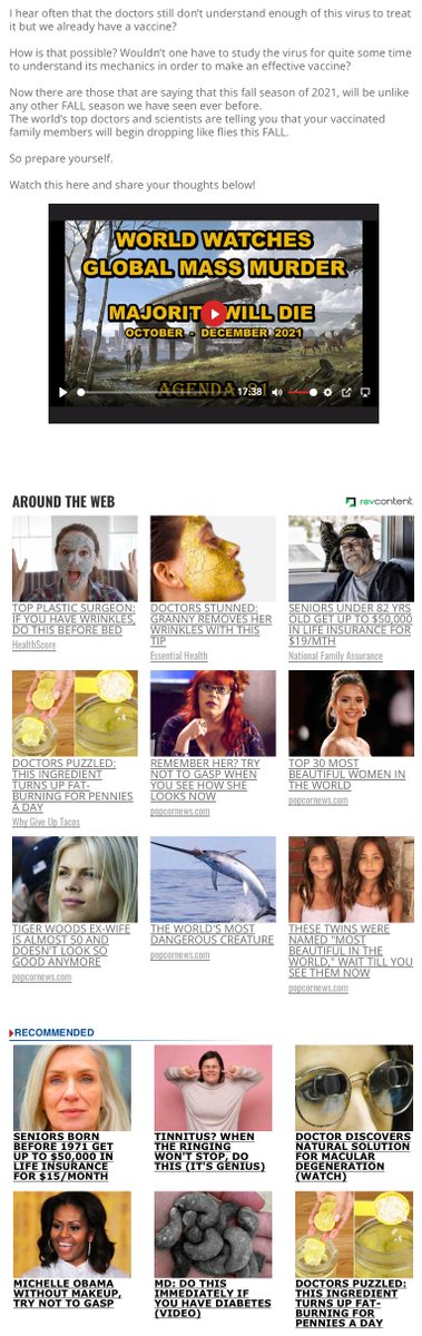 The "news story," once it loads, reads like a bad rehash of a Facebook post: Vague comments about "the rush to vaccinate" and "no one knows what's in it" that are familiar to anyone who watched the pre-COVID antivax movement.