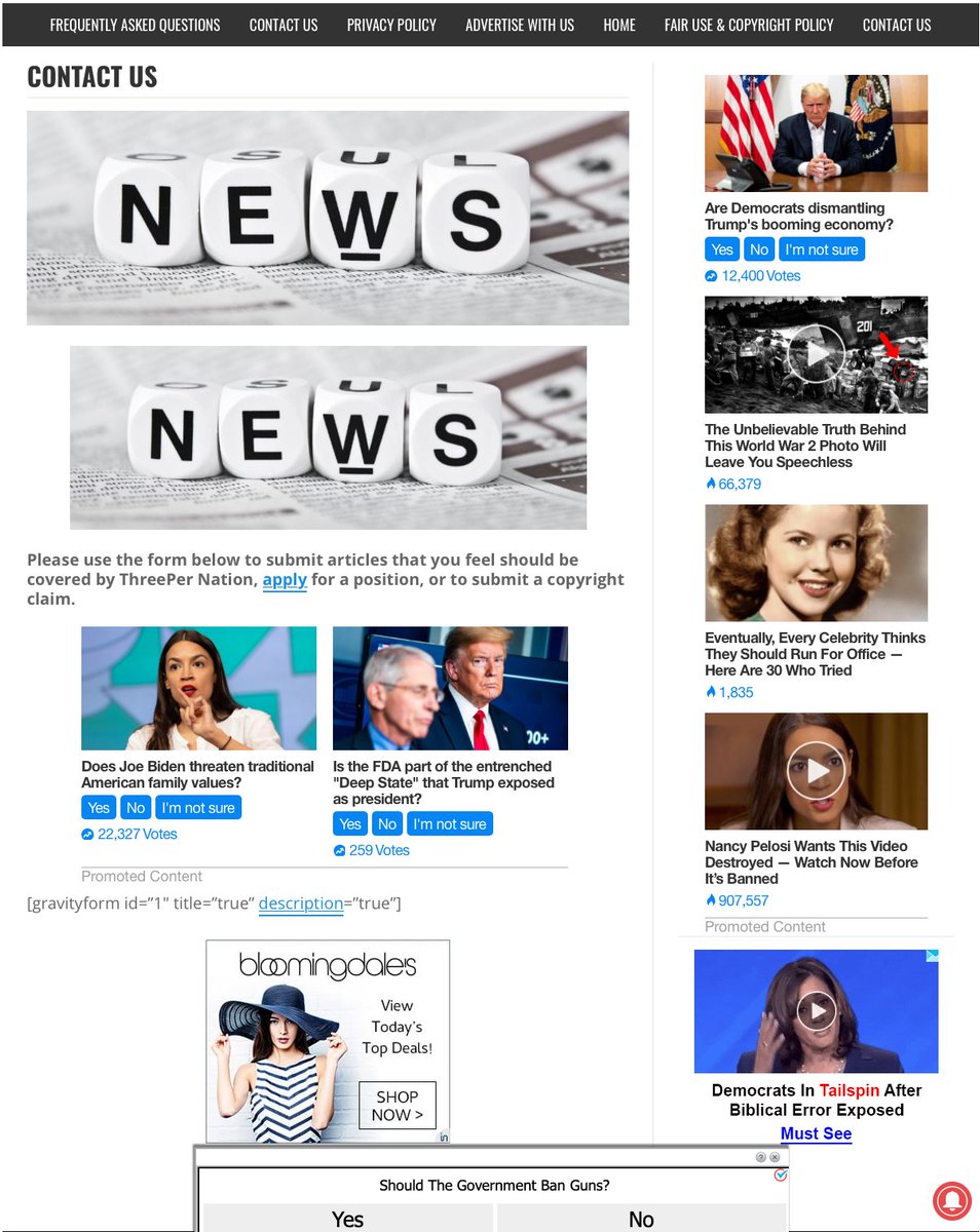 Like most of these sites, it has no fixed identity. The domain (threepercentnation dot com) was registered in 2014, and despite an "archive" of news stories going back to 2014, seems to have spent most of its life as a GoDaddy parking page.