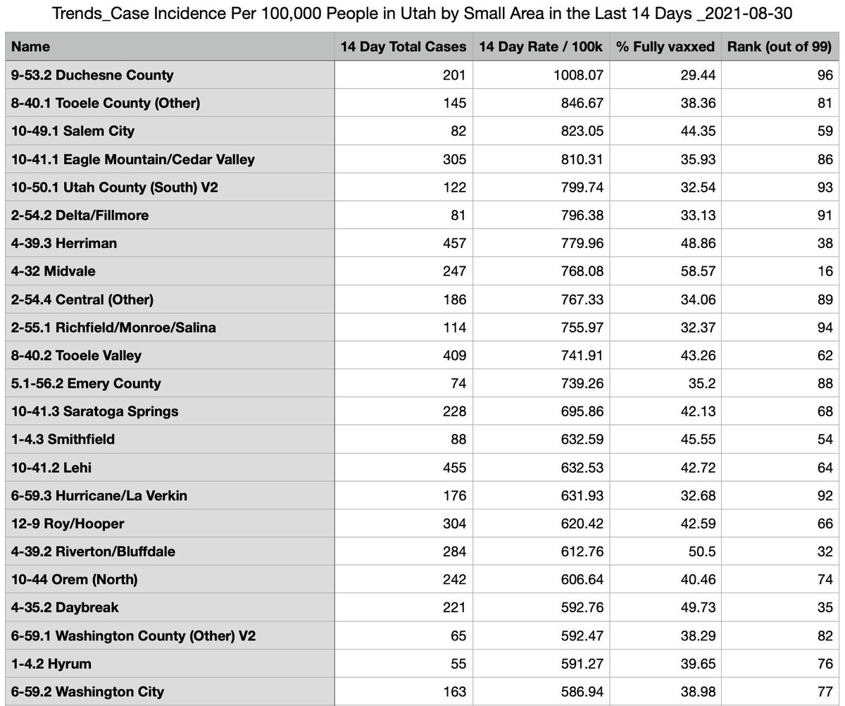 And here are the communities with the highest infection rates. Things have really blown up in Duchesne — 1 out of every 99 residents testing positive in the last two weeks. #utpol