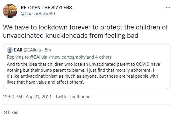 I mean he’s literally arguing in favor of letting the disease spread freely because attempting to prevent new cases would interfere with his hot vax summer. And of course any cases among the unvaccinated in adjacent communities are just irrelevant