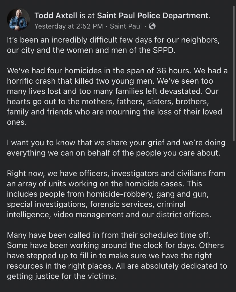 Police arrested a 37-year-old man - suspected in his death. St. Paul PD Chief Todd Axtell put up this post on FB saying, “it’s been an incredibly difficult few days for our neighbors, city and the men and women of SPPD.” @kare11