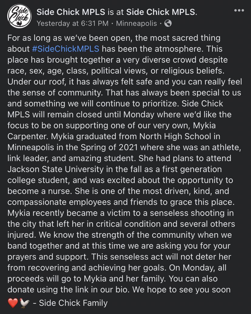 Side Chick restaurant announced they will remain closed until Monday to focus on supporting one of their own. The proceeds from Monday will go to Mykia. @kare11