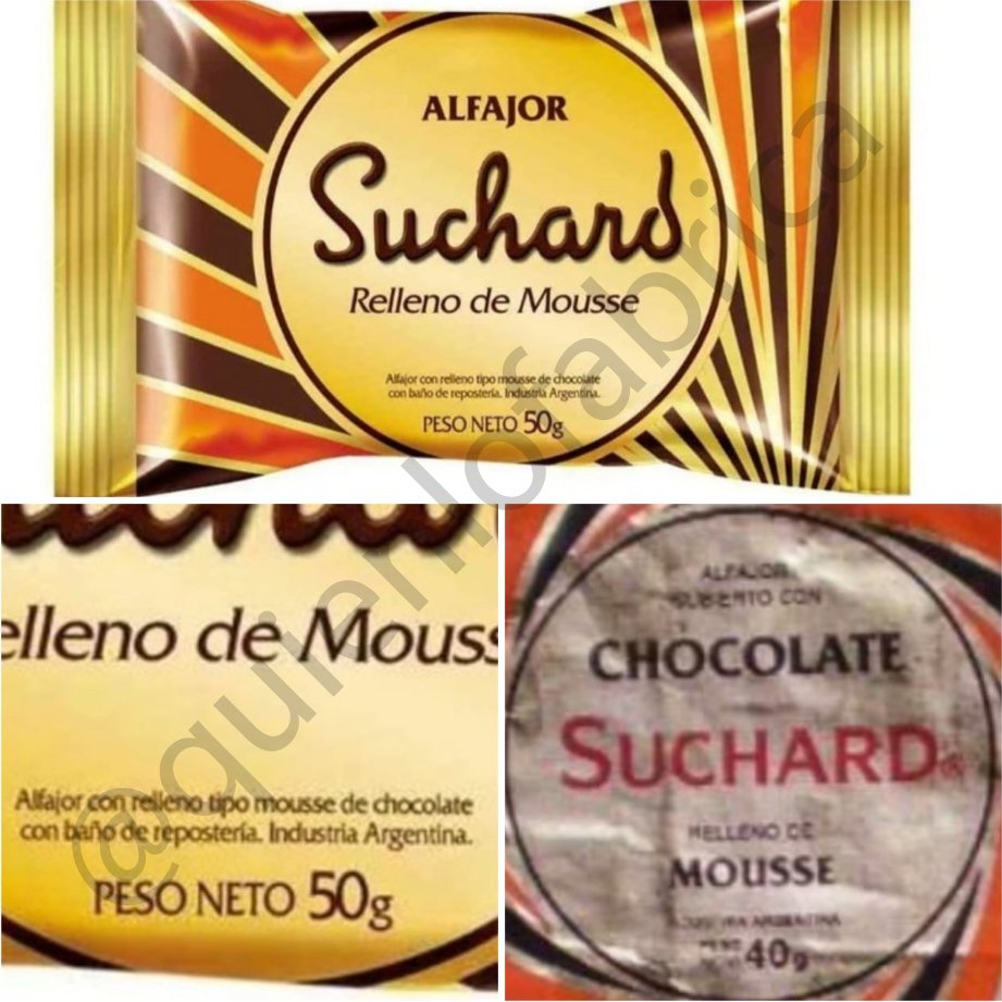 El famoso alfajor Suchard que hace poco volvió a fabricarse, vemos como en su antigua versión estaba cubierto de chocolate, ahora es "con relleno tipo mousse de chocolate y con baño de reposteria"