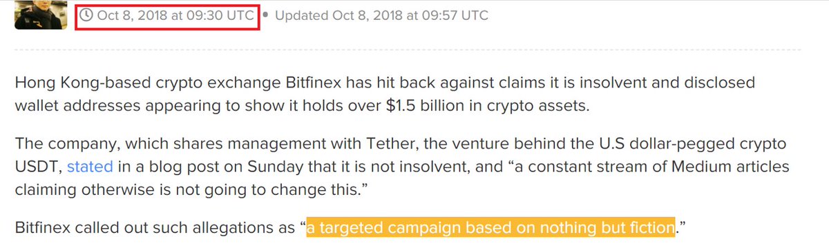16/ This may or may not be related, but (@Tether_to + @bitfinex), were going through *tough times* back in Oct. + Nov. 2018 ; that was when I exposed the fact they were insolvent (backed up by the New York AG), leading to the peg nearly breaking.