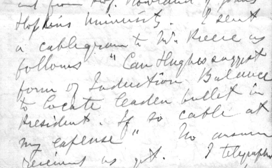 Bell believed that he knew a way to locate the bullet in President Garfield's body. In this letter to his wife he reproduces the telegram in which he first outlined the idea: 'an Induction Balance to locate leaden bullet in President'. An early form of metal detector, in fact.