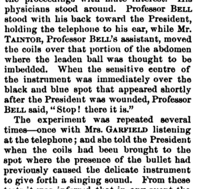 According to one contemporary report, Bell succeeded in locating the bullet, and even passed the receiver to the President's wife so that she could hear for herself. Alas, this account is entirely fictional.