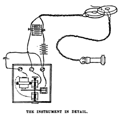 In 1885, Waller (r) started to investigate electrical activity in animal hearts using a Lippmann capillary electrometer, an instrument which employed a column of mercury to detect electrical current. Tiny deflections in the height of the column were observed through a microscope.