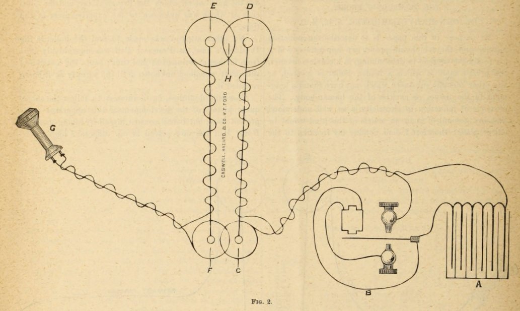 This is a a schematic diagram of their invention. The telephone receiver was not connected to a power source; but if a metal object came into the region marked 'H', a small current was induced into the circuit, heard as a clicking in the earpiece.