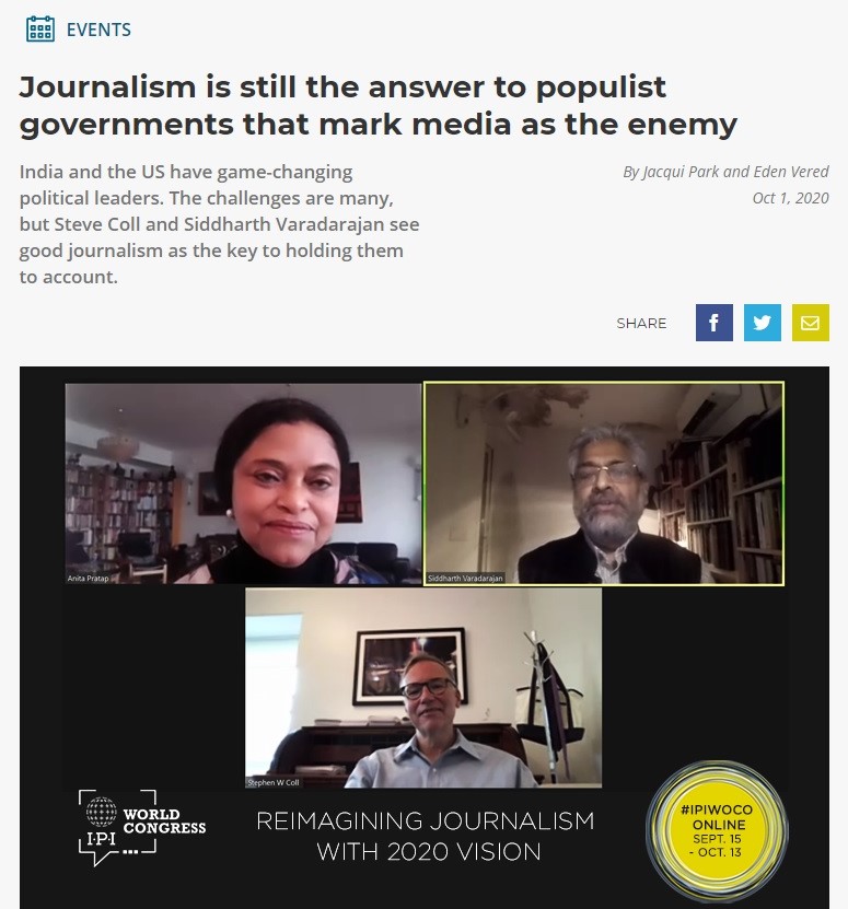 Here is what the speakers from Indian media spoke about at IPI's World Cong. Notice the topic Siddharth Varadarajan of The Wire spoke about.