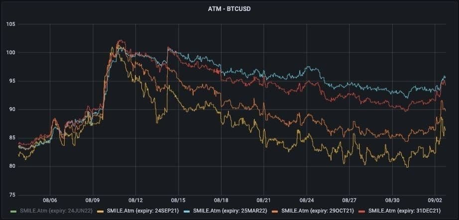8/ BTC realised vols remain low causing the implied-realised gap to widen. There has also been a slight steepening in the term structure with Dec vols remaining elevated. We remain short BTC gamma and vega against our long spot position.