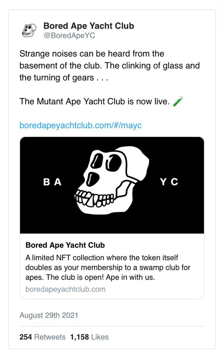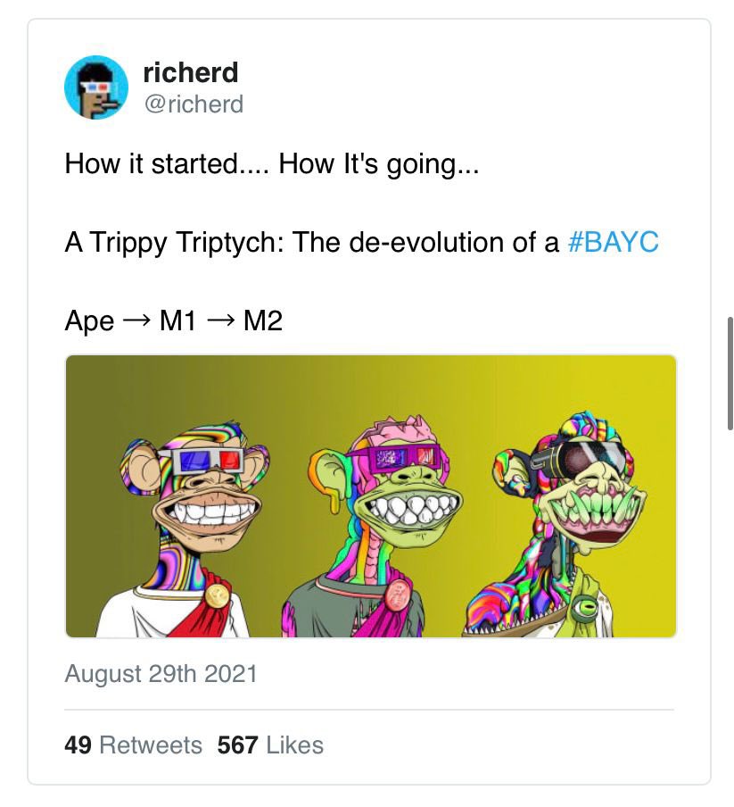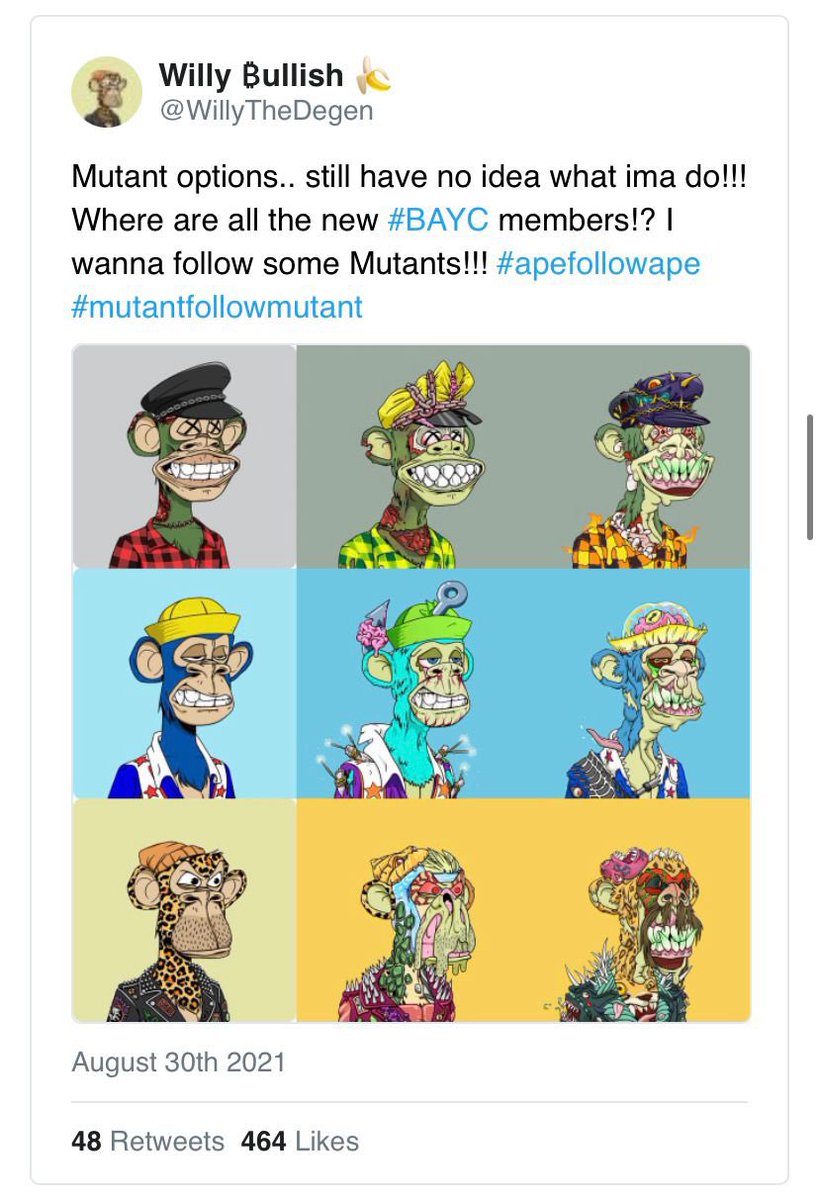 4) Last week the BAYC team announced a surprise airdrop of 10k “mutant serum” NFTs on a 1:1 basis with Bored Ape holders and in doing so unveiled the arrival of the MAYC collection. Shortly thereafter, BAYC revealed up to 20k new Mutant Apes would be possible.