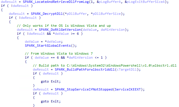 From Windows Vista to Windows 7, SPARKLOG uses a well-known DLL hijacking technique that involves dropping PRIVATELOG as %SYSTEM32%\WindowsPowershell\v1.0\wlbsctrl.dll, then stops and starts the legitimate Windows’ IKEEXT service to load it. 5/11