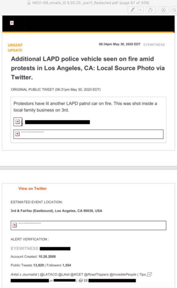 In one example a Dataminr alert included a Tweet from me while I was on the ground covering a BLM organized protest in the Fairfax area on May 30. Minutes after the Tweet went live a copy landed in LAPD Officer Mathew Rejis' inbox.