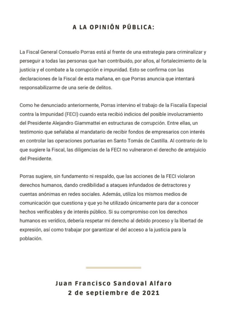 Este jueves, la fiscal general Consuelo Porras acusó a Sandoval de generar una “campaña de revanchismo, desinformación y desprestigio”, y anunció que el Ministerio Público inició una investigación contra Sandoval por presunta “divulgación de información”. elperiodico.com.gt/politica/justi…
