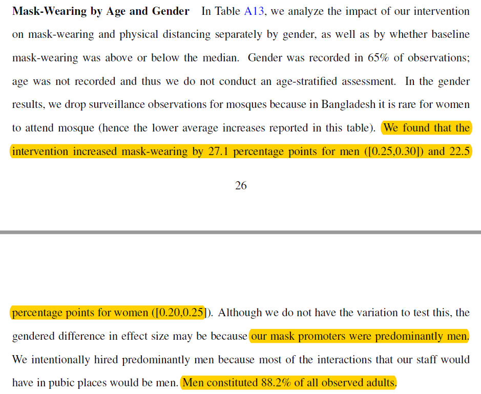 One way to assess if results driven by masks and not distancing because no physical distancing in Mosques is to do a gender subgroup analysis of primary outcome since men & woman in Bangladesh have very different social behaviors