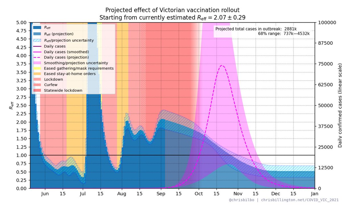 TL;DR, this much. Here's the current NSW projection with 70%, 80% and 88% reduction in spread assumed for fully vaccinated people (and half that for single-dosed). More on those numbers below. 2/🧵
