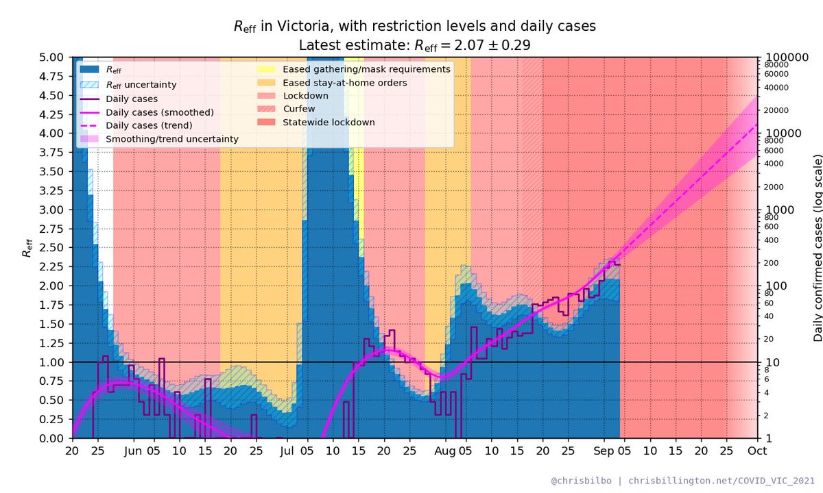 You can see that we did not see the projected effect of vaccinations for some time. If they were working as expected, something else must have been increasing R_eff at the same time. If you squint, maybe the decrease in R since mid-August has been in line with expectations.