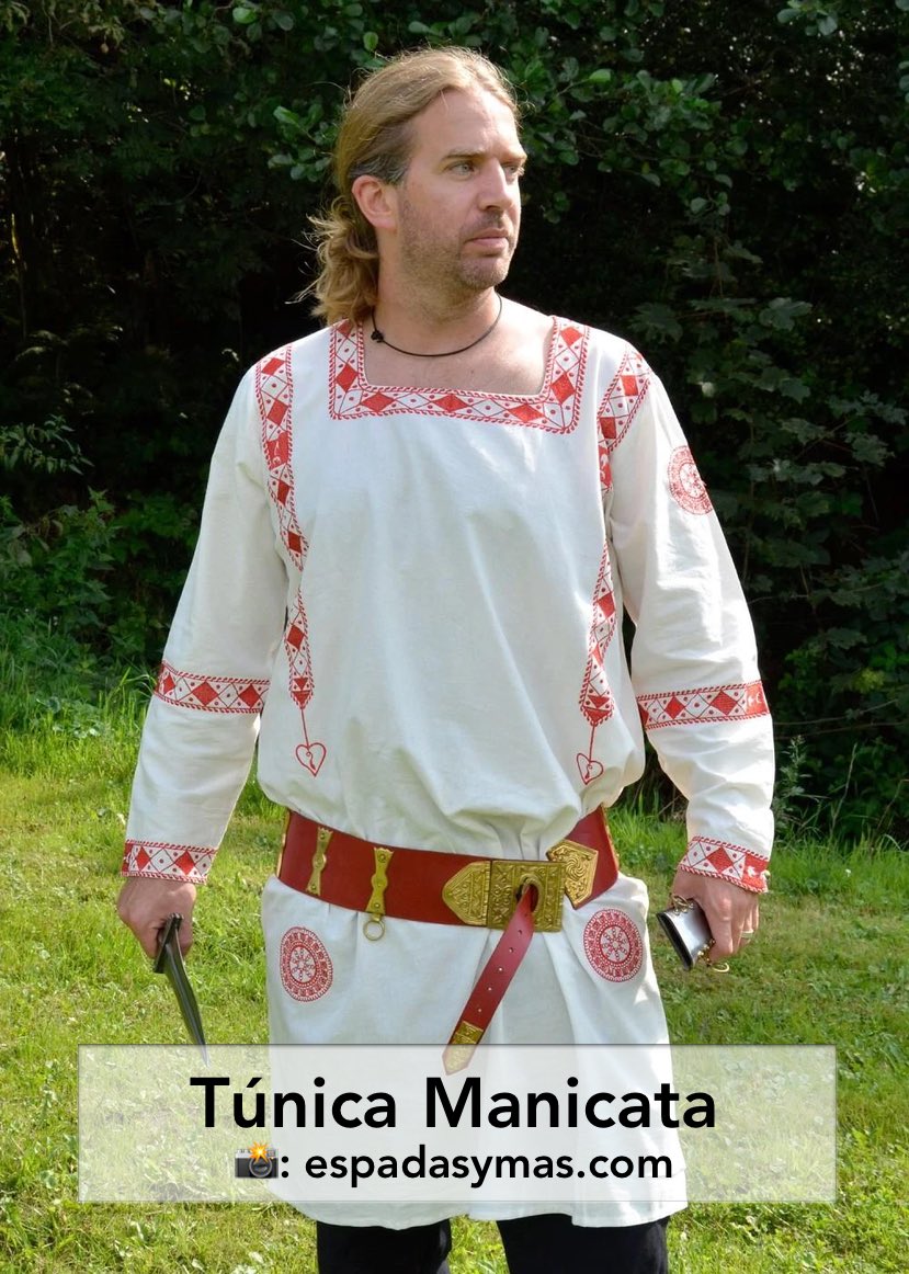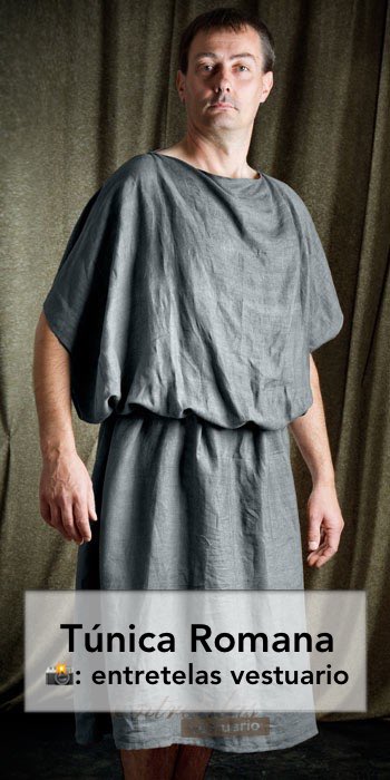 2) La túnica: era una adaptación del chiton griego. Se trataba de un rectángulo abierto lateralmente que se sujetaba a la cintura. Se cerraba con fíbulas o pequeños botones, y su dimensión y longitud dependían del tamaño del cuerpo del que la llevase.