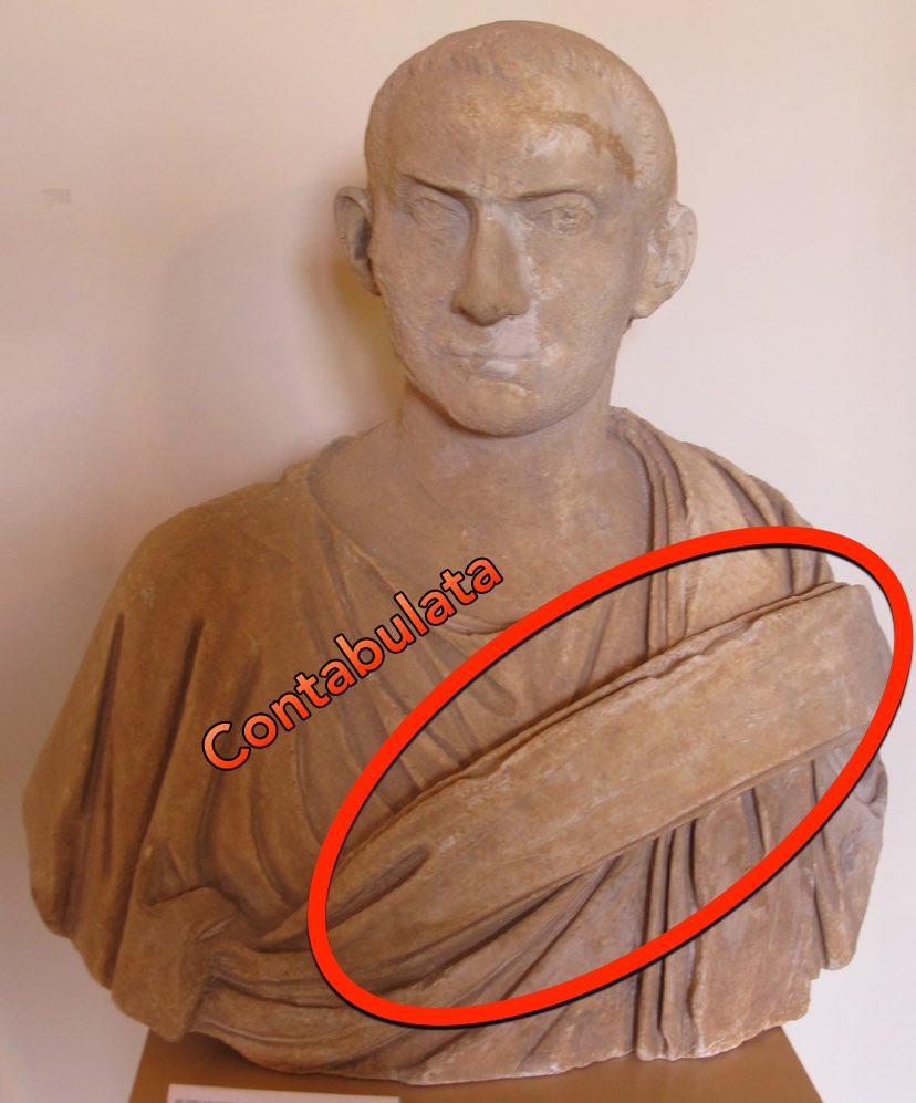 En el Bajo Imperio se impuso la toga contabulata, que se caracterizaba por tener la banda terciada asemejando una contabulatio (tabla de madera) cruzando diagonalmente el pecho.
