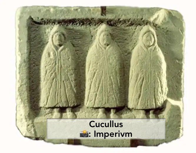5) El cucullus: Procedente de la Galia (y muy popular allí), era una capa corta con capucha muy empleada en territorios fríos. Se asemejaba a la paenula, pero remataba en forma triangular y se echaba encima de la túnica y el manto.