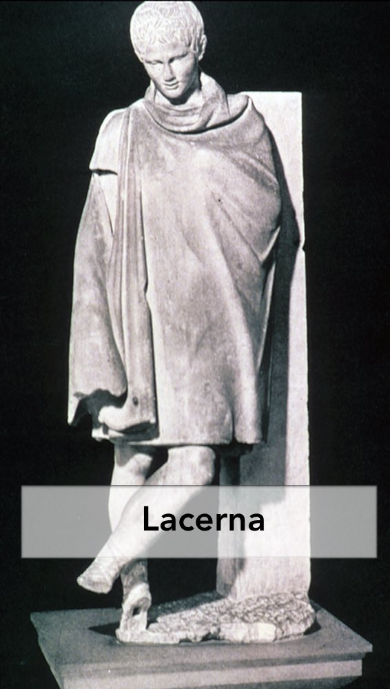 ~ La lacerna era otro amplio manto rectangular. Originario gaélico, era de lana muy densa y pesada y de color oscuro. Su uso fue habitual tanto entre civiles como militares y con independencia de las clases sociales.