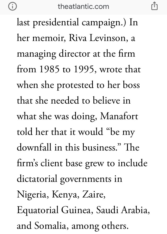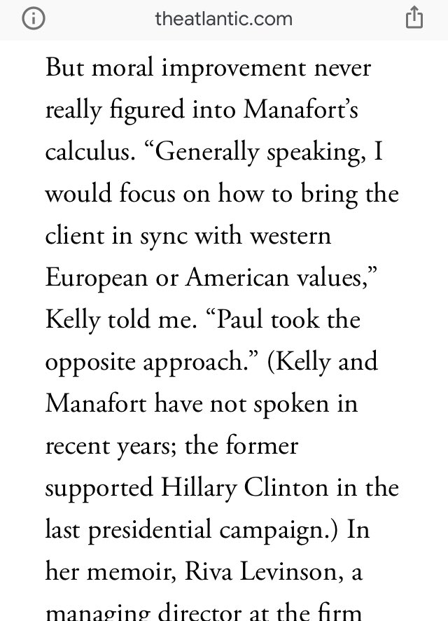 @arapaho415@TeresaCCarter2@insiderfilms1@sisu_sanity@clearing_fog@TheAtlantic In her memoir, Riva Levinson, a managing director at the firm from 1985 to 1995, wrote that when she protested to her boss that she needed to believe in what she was doing, Manafort told her that it would “be my downfall in this business.”