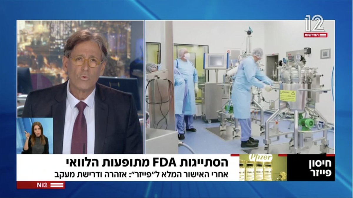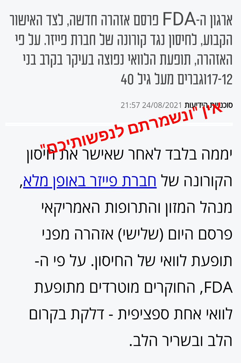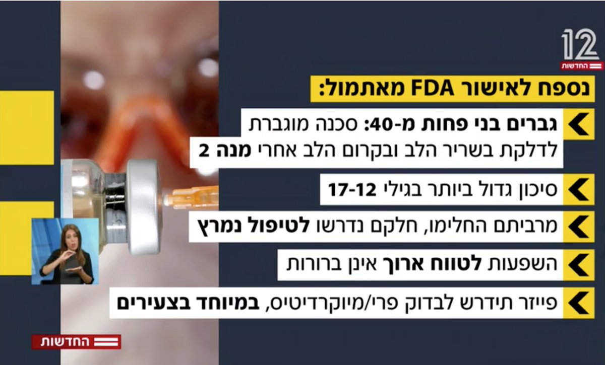 "*יממה בלבד* לאחר שאישר את חיסון הקורונה של חברת פייזר באופן מלא, מנהל המזון והתרופות האמריקאי פרסם היום (שלישי) אזהרה מפני תופעת לוואי של החיסון".